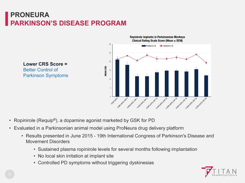 11 * GlobalData; **Parkinson’s Action Network, National Center for Health Statistics; “The Current and Projected Economic Burden of Parkinson’s Disease in the United States” Movement Disorders, March 2013 Based on information from Titan and other sources believed to be reliable and prepared exclusively for Titan. Woodside Capita l P artners is not responsible for any use that Titan may make of this material. Sales of Dopamine Agonists, U.S.* Year Total Sales % DA $ DA 2012 $1.1 Billion 26% $286 Million 2022 $2.3 Billion 18% $414 Million Cost to American Society ** $14.4 Billion Annually Treatment Costs $8.1 Billion Indirect Costs $6.3 Billion If costs continue to rise they will double by 2040 • As many as 1 million people in the U . S . affected • That number is expected to almost double by 2030 due to aging of population • About 60 , 000 newly diagnosed for PD annually • More than 23 , 000 die from PD each year PARKINSON’S DISEASE THERAPEUTICS MARKET