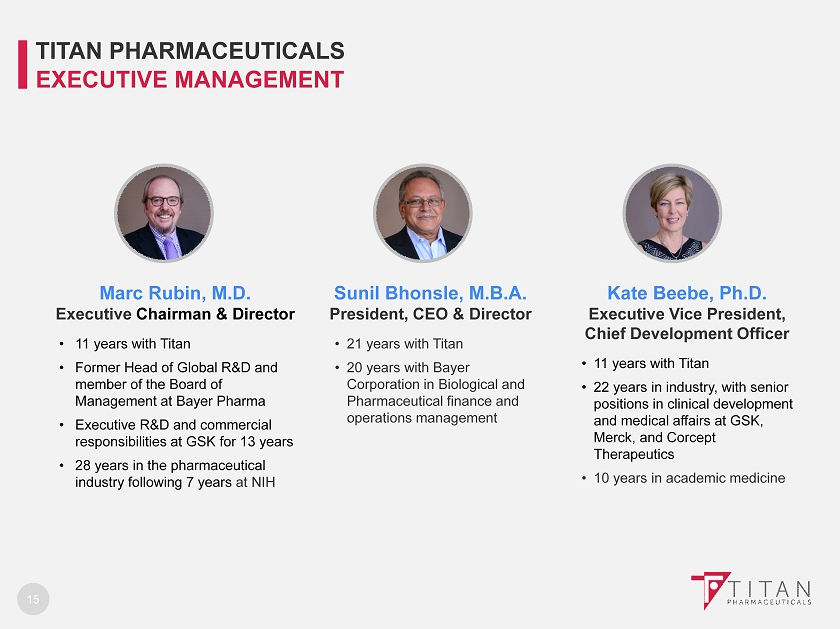 15 Marc Rubin, M.D. Executive Chairman & Director • 11 years with Titan • Former Head of Global R&D and member of the Board of Management at Bayer Pharma • Executive R&D and commercial responsibilities at GSK for 13 years • 28 years in the pharmaceutical industry following 7 years at NIH Sunil Bhonsle, M.B.A. President, CEO & Director • 21 years with Titan • 20 years with Bayer Corporation in Biological and Pharmaceutical finance and operations management Kate Beebe, Ph.D. Executive Vice President, Chief Development Officer • 11 years with Titan • 22 years in industry, with senior positions in clinical development and medical affairs at GSK, Merck, and Corcept Therapeutics • 10 years in academic medicine TITAN PHARMACEUTICALS EXECUTIVE MANAGEMENT