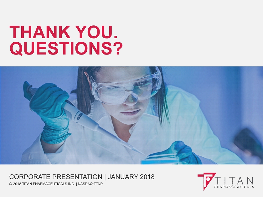 THANK YOU. QUESTIONS? © 2018 TITAN PHARMACEUTICALS INC. | NASDAQ:TTNP CORPORATE PRESENTATION | JANUARY 2018