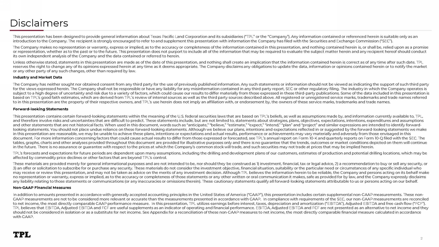 Disclaimers This presentation has been designed to provide general information about Texas Pacific Land Corporation and its subsidiaries (“TPL” or the “Company”). Any information contained or referenced herein is suitable only as an introduction to the Company. The recipient is strongly encouraged to refer to and supplement this presentation with information the Company has filed with the Securities and Exchange Commission (“SEC”). The Company makes no representation or warranty, express or implied, as to the accuracy or completeness of the information contained in this presentation, and nothing contained herein is, or shall be, relied upon as a promise or representation, whether as to the past or to the future. This presentation does not purport to include all of the information that may be required to evaluate the subject matter herein and any recipient hereof should conduct its own independent analysis of the Company and the data contained or referred to herein. Unless otherwise stated, statements in this presentation are made as of the date of this presentation, and nothing shall create an implication that the information contained herein is correct as of any time after such date. TPL reserves the right to change any of its opinions expressed herein at any time as it deems appropriate. The Company disclaims any obligations to update the data, information or opinions contained herein or to notify the market or any other party of any such changes, other than required by law. Industry and Market Data The Company has neither sought nor obtained consent from any third party for the use of previously published information. Any such statements or information should not be viewed as indicating the support of such third party for the views expressed herein. The Company shall not be responsible or have any liability for any misinformation contained in any third party report, SEC or other regulatory filing. The industry in which the Company operates is subject to a high degree of uncertainty and risk due to a variety of factors, which could cause our results to differ materially from those expressed in these third - party publications. Some of the data included in this presentation is based on TPL’s good faith estimates, which are derived from TPL’s review of internal sources as well as the third party sources described above. All registered or unregistered service marks, trademarks and trade names referred to in this presentation are the property of their respective owners, and TPL’s use herein does not imply an affiliation with, or endorsement by, the owners of these service marks, trademarks and trade names. Forward - looking Statements This presentation contains certain forward - looking statements within the meaning of the U.S. federal securities laws that are based on TPL’s beliefs, as well as assumptions made by, and information currently available to, TPL, and therefore involve risks and uncertainties that are difficult to predict. These statements include, but are not limited to, statements about strategies, plans, objectives, expectations, intentions, expenditures and assumptions and other statements that are not historical facts. When used in this document, words such as “anticipate,” “believe,” “estimate,” “expect,” “intend,” “plan” and “project” and similar expressions are intended to identify forward - looking statements. You should not place undue reliance on these forward - looking statements. Although we believe our plans, intentions and expectations reflected in or suggested by the forward - looking statements we make in this presentation are reasonable, we may be unable to achieve these plans, intentions or expectations and actual results, performance or achievements may vary materially and adversely from those envisaged in this document. For more information concerning factors that could cause actual results to differ from those expressed or forecasted, see TPL’s annual report on Form 10 - K and quarterly reports on Form 10 - Q filed with the SEC. The tables, graphs, charts and other analyses provided throughout this document are provided for illustrative purposes only and there is no guarantee that the trends, outcomes or market conditions depicted on them will continue in the future. There is no assurance or guarantee with respect to the prices at which the Company’s common stock will trade, and such securities may not trade at prices that may be implied herein. TPL’s forecasts and expectations for future periods are dependent upon many assumptions, including the drilling and development plans of our customers, estimates of production and potential drilling locations, which may be affected by commodity price declines or other factors that are beyond TPL’s control. These materials are provided merely for general informational purposes and are not intended to be, nor should they be construed as 1) investment, financial, tax or legal advice, 2) a recommendation to buy or sell any security, or 3) an offer or solicitation to subscribe for or purchase any security. These materials do not consider the investment objective, financial situation, suitability or the particular need or circumstances of any specific individual who may receive or review this presentation, and may not be taken as advice on the merits of any investment decision. Although TPL believes the information herein to be reliable, the Company and persons acting on its behalf make no representation or warranty, express or implied, as to the accuracy or completeness of those statements or any other written or oral communication it makes, safe as provided for by law, and the Company expressly disclaims any liability relating to those statements or communications (or any inaccuracies or omissions therein). These cautionary statements qualify all forward - looking statements attributable to us or persons acting on our behalf. Non - GAAP Financial Measures In addit