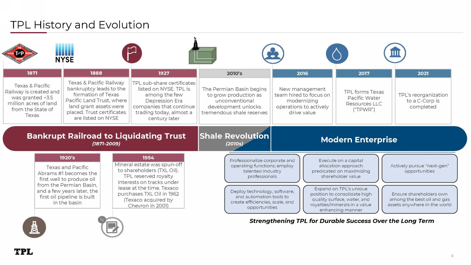 Texas Pacific Land Corporation (NYSE: TPL) TPL by the Numbers 1 Market Value ($MM) $13 ,225 Cash & Equivalents ($MM) $7 25 Debt ($MM) $0 Net Royalty Acres (100% net basis) ~ 2 3 , 7 00 Normalized to 1/8 th ~1 9 5 ,000 Surface Acres ~ 868,000 2023 Adj. EBITDA Margin 86% 2023 FCF Margin 66% Average daily trading volume (1 - yr avg) ~ 98,000 Free Cash Flow ($MM) FY 2023 Revenues ($MM) ▪ One of the largest landowners in Texas with approximately 868,000 acres located in the Permian Basin ▪ TPL was originally organized in 1888 as a business trust to manage the property of the Texas and Pacific Railway Company; for nearly 130 years, this management was mostly passive ▪ In 2016, the Company embarked on a new strategy to maximize the value of its footprint through active management of surface and royalty interests ▪ Today, the business consists of numerous high - margin, capital - light revenue streams linked to Permian oil and gas development – Oil and Gas Royalties: high - margin royalty revenue derived from oil and gas production with no capital and minimal operating expense burden – Surface Leases, Easements and Material (“SLEM”): monetizes 3 rd party development activities occurring on surface and royalty acreage – Texas Pacific Water Resources (“TPWR”): supplies water for oil and gas activities and facilitates produced water disposal solutions Adjusted EBITDA ($MM) 69% 31% Land & Resource Management Water Service & Operations $ 63 2 M $1 4 5 $ 2 4 5 $3 0 2 $ 2 39 $ 3 8 8 $ 5 9 2 $ 5 4 1 $ 8 0 $1 6 0 $ 2 34 $ 1 88 $ 2 78 $452 $ 4 1 5 $63 $40 2 0 1 6 2017 2 0 1 8 2 0 1 9 2 0 20 2021 2 0 22 2 0 23 2016 2017 2018 2019 2020 2021 2022 2023 4 (1) Balance sheet data as of 12/31/2023. Market value and average daily trading volume as of 3/25/2024. Trading volume reflects 3:1 stock split in March 2024.
