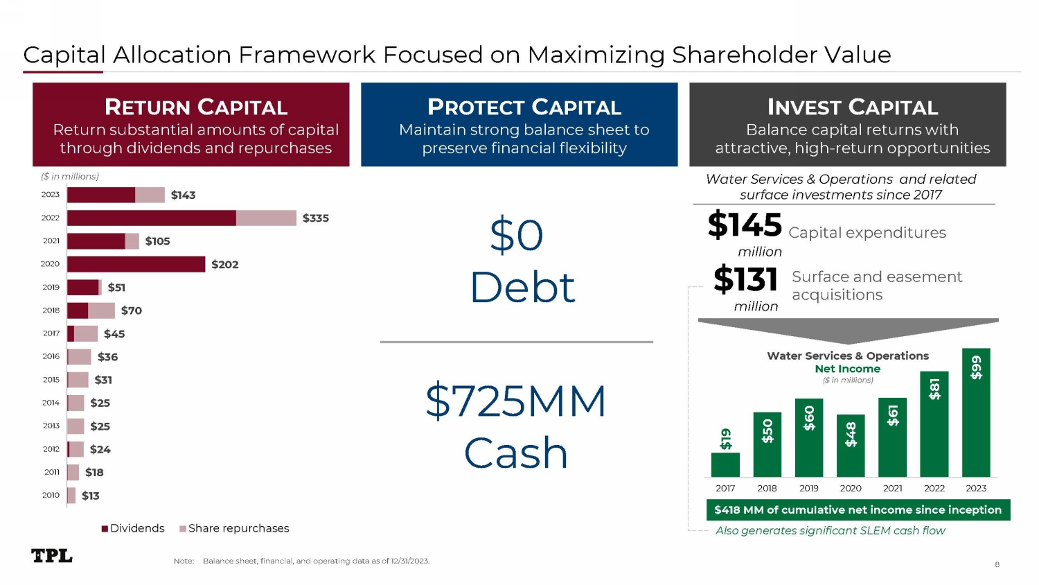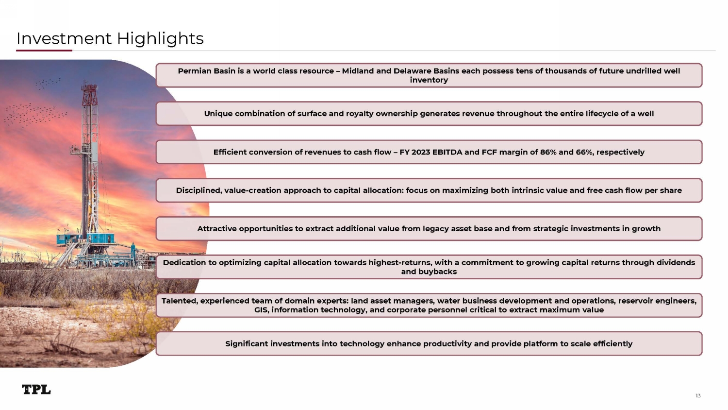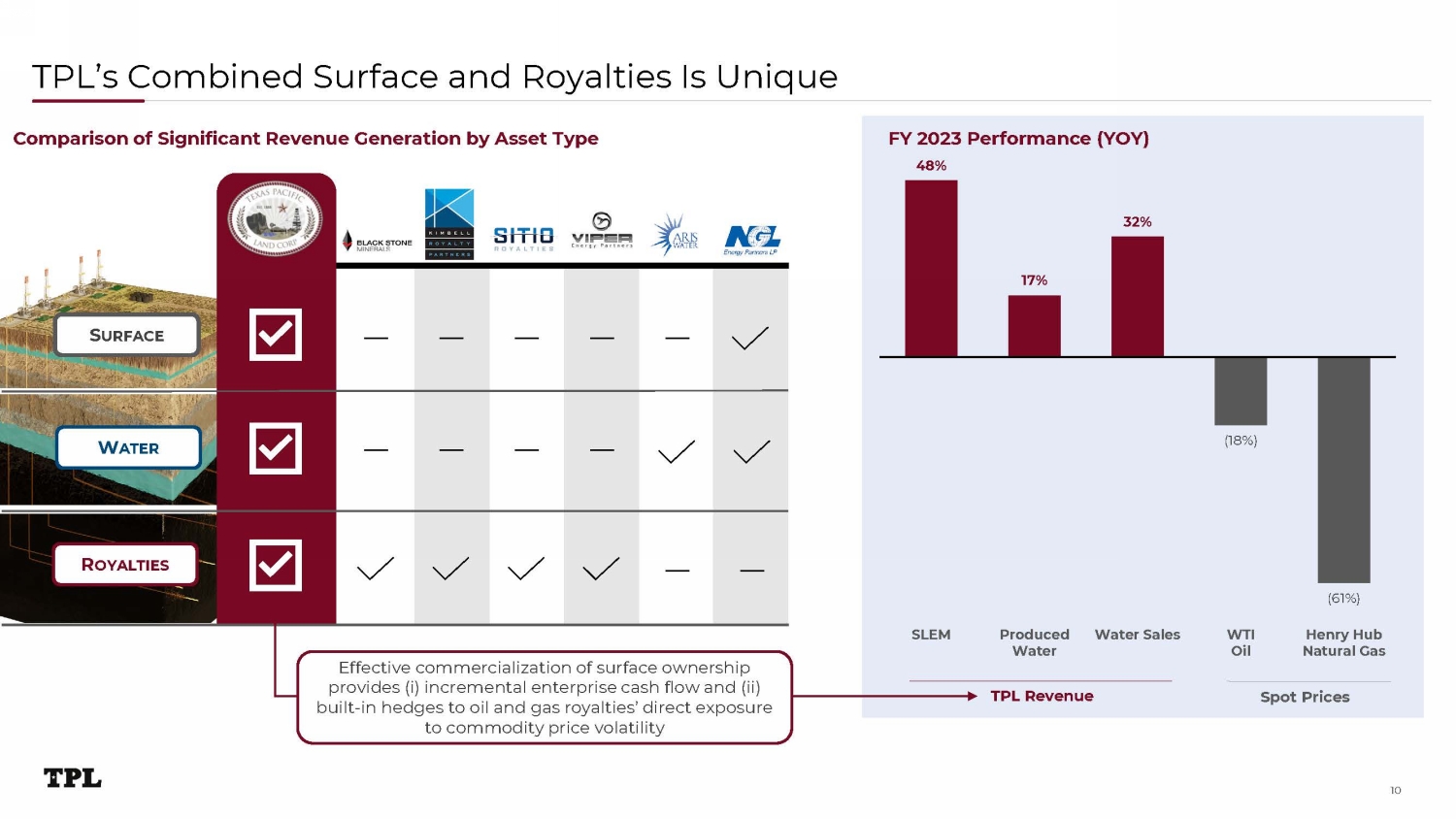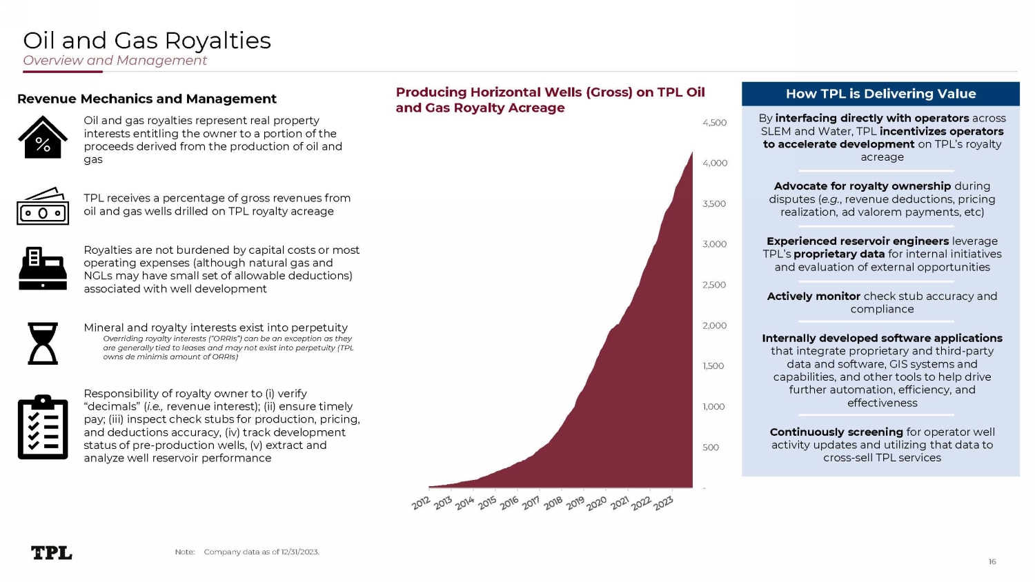 TPL Currently Has Four Primary Revenue Streams ▪ Primarily own Non - Participating Royalty Interests (NPRI), which represents a real property right and is entitled to a fixed percentage of oil and gas production on a property ▪ Royalties are not burdened by capital expenditures ( e.g., drilling and completions costs), or most operating expense ( e.g. , lease operating expense) ▪ Revenue stream contained in Land & Resource Management segment ▪ Surface acreage provides multiple income streams from leases, easements, and caliche/materials, among others ▪ Opportunity for new revenue streams from emerging technologies ( e.g., solar, wind, and carbon capture) ▪ Majority of SLEM revenues flow into Land & Resource Management segment, with a relatively smaller amount typically in Water Services & Operations ▪ Facilitates disposal of water produced from oil and gas wells ▪ By allowing use of its surface acreage for produced water disposal infrastructure, TPL generates a volumetric royalty fee on produced water barrels ▪ TPL does not own or operate produced water disposal wells ▪ Revenue stream contained in Water Services & Operations $2 8 $ 5 8 $155 $138 $124 $2 8 6 $4 5 2 $ 3 5 7 2016 2017 2018 2019 2020 2021 2022 2023 O&G R OYALTIES S URFACE L EASES , E ASEMENTS AND M ATERIAL (“SLEM”) W ATER S ALES P RODUCED W ATER R OYALTIES ▪ Surface acreage provides ownership of water rights and opportunities to supply water for use in oil and gas well development ▪ TPL owns and operates a network of water wells, storage/frac ponds and pipelines that can source and deliver water to customers ▪ Revenue stream contained in Water Services & Operations $2 6 $42 $ 71 $ 76 $ 41 $ 3 8 $ 48 $ 71 2016 2017 2018 2019 2020 2021 2022 2023 SLEM Revenue ($ in millions) $8 $2 6 $ 6 4 $ 8 5 $ 5 5 $ 6 8 $ 8 5 $112 2016 2017 2018 2019 2020 2021 2022 2023 $0 $6 $17 $ 3 9 $ 5 1 $ 5 8 $ 72 Produced Water Royalties Revenue ($ in millions) $ 8 4 2016 2017 2018 2019 2020 2021 2022 2023 of Consolidated Revenues (FY 2023) 5 7 % Note: Revenue percentages do not sum to 100% due to other ancillary revenue items. of Consolidated Revenues (FY 2023) 11% of Consolidated Revenues (FY 2023) of Consolidated Revenues (FY 2023) 1 3% O&G Royalties Revenue ($ in millions) 1 8% Water Sales ($ in millions) 15