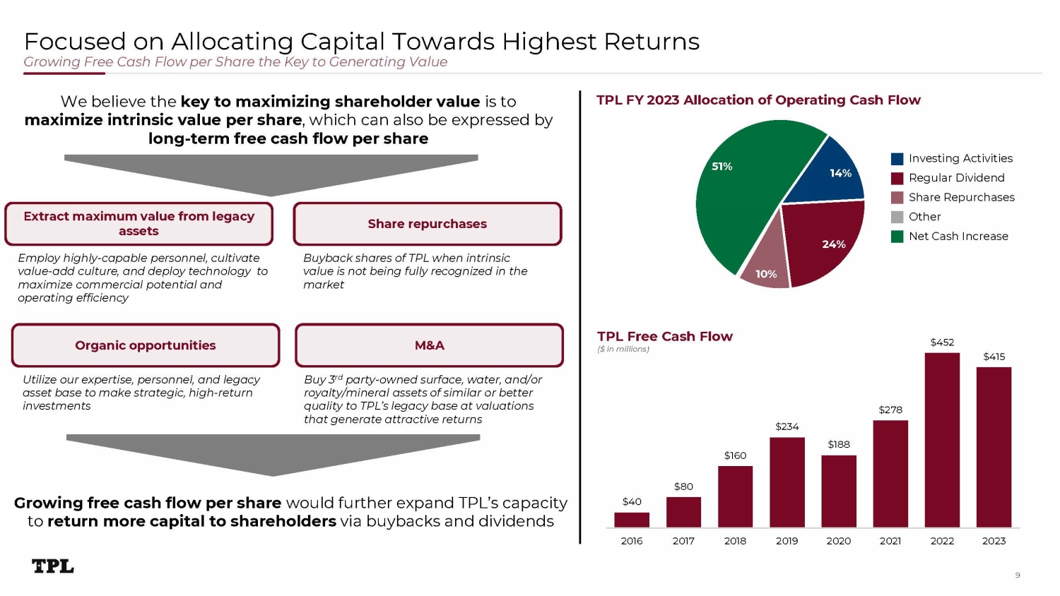 Focused on Allocating Capital Towards Highest Returns Growing Free Cash Flow per Share the Key to Generating Value Growing free cash flow per share would further expand TPL’s capacity to return more capital to shareholders via buybacks and dividends 1 4% 2 4% 1 0% 5 1 % Investing Activities Regular Dividend Share Repurchases Other Net Cash Increase We believe the key to maximizing shareholder value is to maximize intrinsic value per share , which can also be expressed by long - term free cash flow per share Extract maximum value from legacy assets TPL FY 2023 Allocation of Operating Cash Flow Share repurchases Organic opportunities M&A Employ highly - capable personnel, cultivate value - add culture, and deploy technology to maximize commercial potential and operating efficiency Buyback shares of TPL when intrinsic value is not being fully recognized in the market Buy 3 rd party - owned surface, water, and/or royalty/mineral assets of similar or better quality to TPL’s legacy base at valuations that generate attractive returns Utilize our expertise, personnel, and legacy asset base to make strategic, high - return investments $ 4 0 9 $1 6 0 $80 $ 2 34 $ 1 88 $ 2 78 $ 4 52 $ 4 1 5 2 0 1 6 2 0 1 7 2 0 1 8 2 0 1 9 2 0 20 2 0 21 2 0 22 2 0 23 TPL Free Cash Flow ($ in millions)