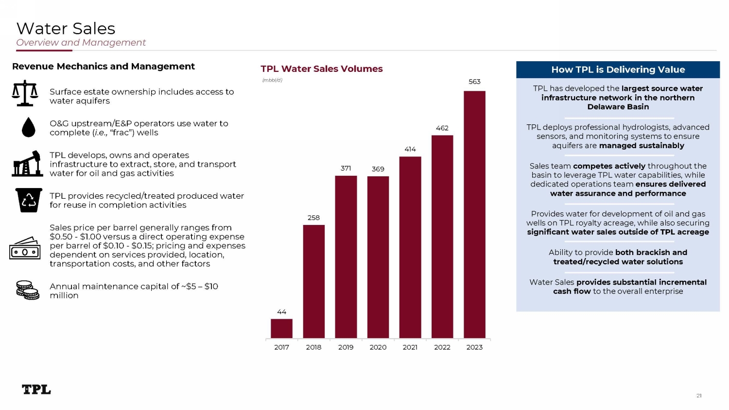 Water Sales Asset Map 24.5 storage capacity mmbbl 6 00+ m bb l/d source water pipelines 335 m ile s 3 54 327 3 88 4 1 0 4 12 Average Fluid Used per Delaware Well Completion (mbbls) 448 4 78 2 0 1 7 2 0 1 8 2 0 1 9 2 0 20 2 0 21 2 0 22 2 0 23 Average O&G well in the Delaware requires an increasing volume of water (~500k bbl water per well) TPL has developed and currently operates the largest source water infrastructure network in the northern Delaware TPL sells substantial water both on and off of TPL acreage TPL Source Water Network N o t e : 22 Enverus and Company data as of 12/31/2023. sourced & treatment capacity