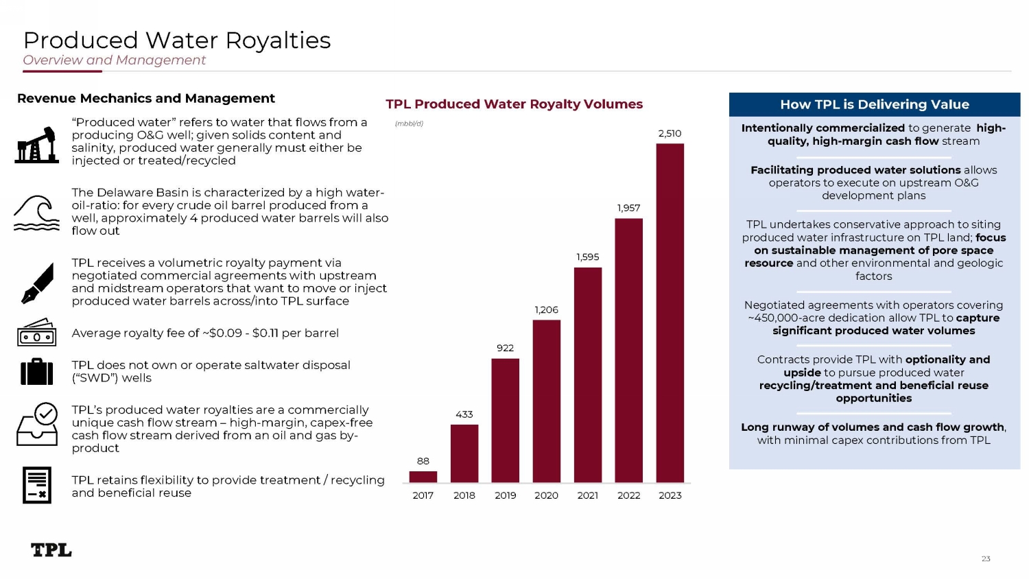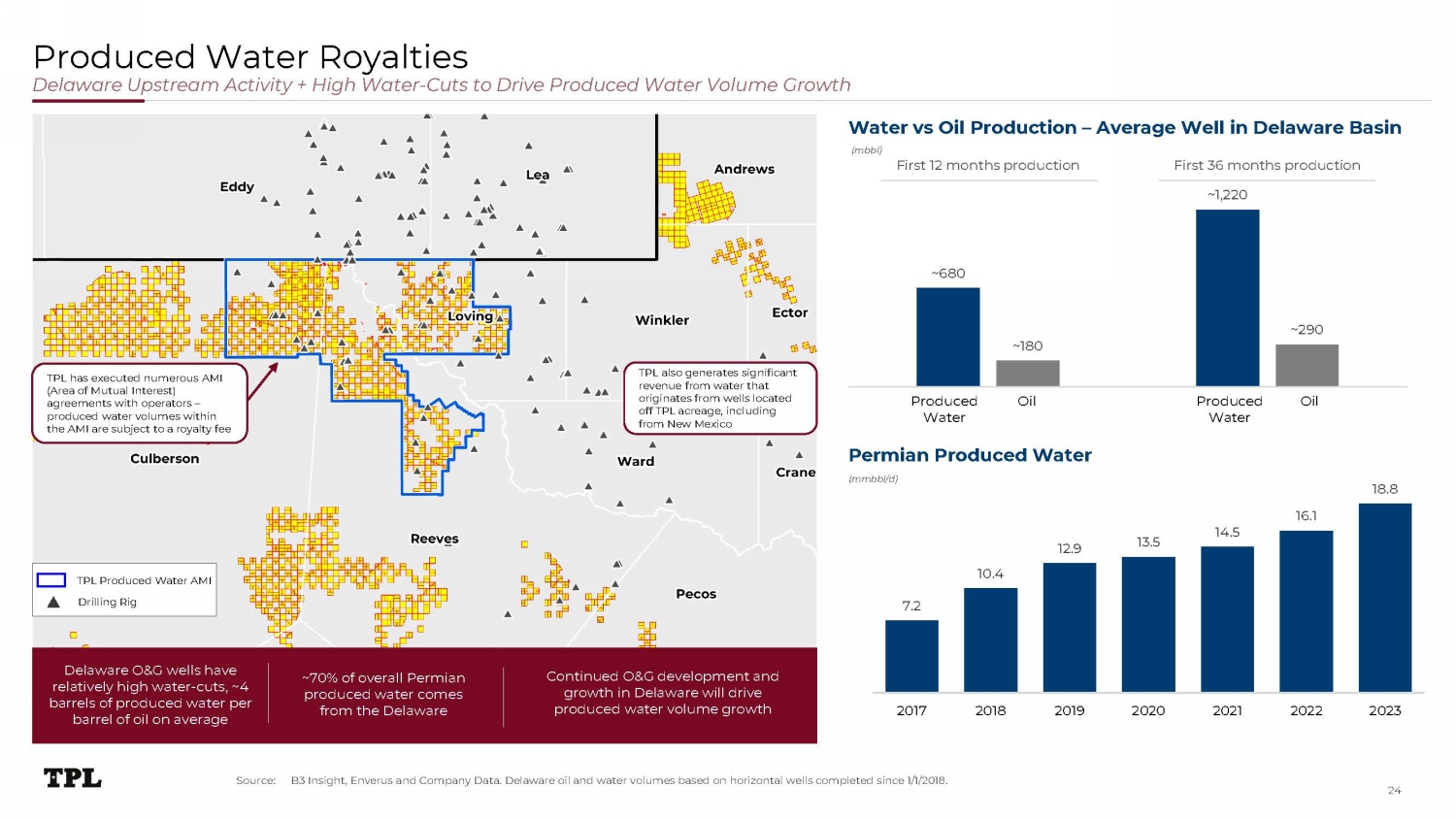 Intentionally commercialized to generate high - quality, high - margin cash flow stream Facilitating produced water solutions allows operators to execute on upstream O&G development plans TPL undertakes conservative approach to siting produced water infrastructure on TPL land; focus on sustainable management of pore space resource and other environmental and geologic factors Negotiated agreements with operators covering ~450,000 - acre dedication allow TPL to capture significant produced water volumes Contracts provide TPL with optionality and upside to pursue produced water recycling/treatment and beneficial reuse opportunities Long runway of volumes and cash flow growth , with minimal capex contributions from TPL Produced Water Royalties Overview and Management 88 4 33 9 22 1 , 206 1 , 5 9 5 1 , 9 57 2, 5 1 0 2017 2018 2019 2020 2021 2022 2023 Revenue Mechanics and Management “Produced water” refers to water that flows from a producing O&G well; given solids content and salinity, produced water generally must either be injected or treated/recycled The Delaware Basin is characterized by a high water - oil - ratio: for every crude oil barrel produced from a well, approximately 4 produced water barrels will also flow out TPL receives a volumetric royalty payment via negotiated commercial agreements with upstream and midstream operators that want to move or inject produced water barrels across/into TPL surface Average royalty fee of ~$0.09 - $0.11 per barrel TPL does not own or operate saltwater disposal (“SWD”) wells TPL’s produced water royalties are a commercially unique cash flow stream – high - margin, capex - free cash flow stream derived from an oil and gas by - product TPL retains flexibility to provide treatment / recycling and beneficial reuse How TPL is Delivering Value TPL Produced Water Royalty Volumes (mbbl/d) 23