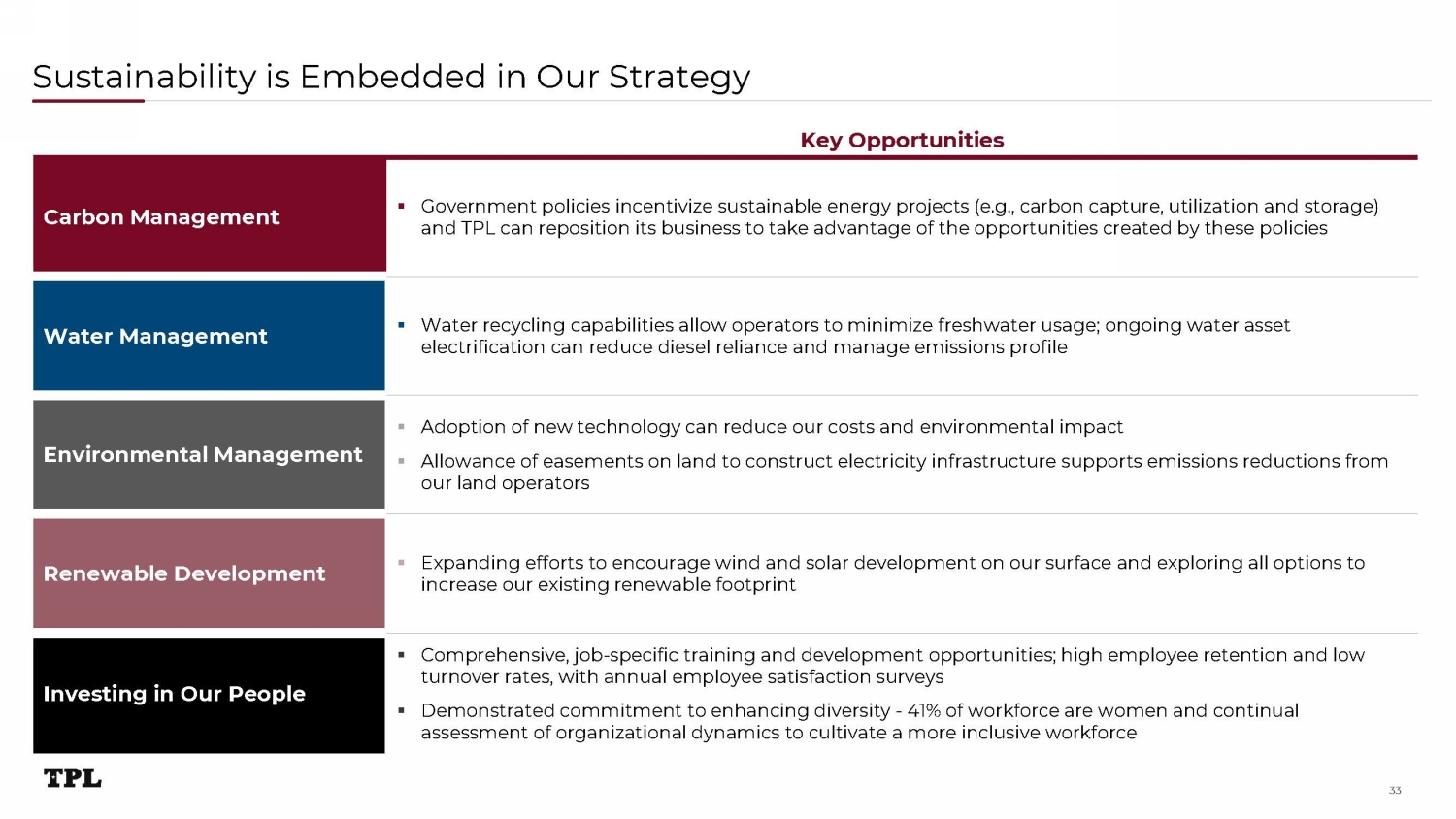 Sustainability is Embedded in Our Strategy 33 Key Opportunities Carbon Management ▪ Government policies incentivize sustainable energy projects (e.g., carbon capture, utilization and storage) and TPL can reposition its business to take advantage of the opportunities created by these policies Water Management ▪ Water recycling capabilities allow operators to minimize freshwater usage; ongoing water asset electrification can reduce diesel reliance and manage emissions profile Environmental Management ▪ Adoption of new technology can reduce our costs and environmental impact ▪ Allowance of easements on land to construct electricity infrastructure supports emissions reductions from our land operators Renewable Development ▪ Expanding efforts to encourage wind and solar development on our surface and exploring all options to increase our existing renewable footprint Investing in Our People ▪ Comprehensive, job - specific training and development opportunities; high employee retention and low turnover rates, with annual employee satisfaction surveys ▪ Demonstrated commitment to enhancing diversity - 41% of workforce are women and continual assessment of organizational dynamics to cultivate a more inclusive workforce