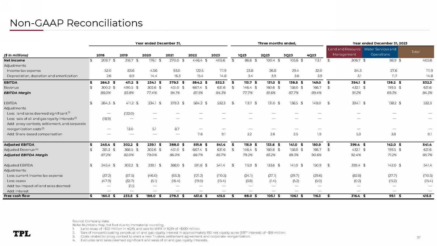 Land and Resource Water Services and Total 2018 2019 2020 2021 2022 2023 1Q23 2Q23 3Q23 4Q23 Management Operations Net income Adjustments: Income tax expense Depreciation, depletion and amortization $ 209.7 $ 318.7 $ 176.1 $ 270.0 $ 446.4 $ 405.6 52.0 83.6 43.6 93.0 122.5 111.9 2.6 8.9 14.4 16.3 15.4 14.8 $ 86.6 $ 100.4 $ 105.6 $ 113.1 23.8 26.8 29.4 32.0 3.4 3.9 3.6 3.9 $ 3 0 6 . 7 $ 9 8 . 9 $ 40 5 . 6 8 4 . 3 2 7 . 6 111 . 9 3 . 1 11 . 7 1 4 .8 EBITDA $ 264.3 $ 411.2 $ 234.1 $ 379.3 $ 584.2 $ 532.3 $ 11 3 . 7 $ 1 3 1 . 0 $ 1 3 8 . 5 $ 1 4 9 .0 $ 3 9 4 . 1 $ 1 3 8 . 2 $ 532 . 3 Revenue $ 300.2 $ 490.5 $ 302.6 $ 451.0 $ 667.4 $ 631.6 $ 1 4 6 . 4 $ 1 6 0 . 6 $ 1 5 8 . 0 $ 1 66 . 7 $ 4 3 2 . 1 $ 1 99 . 5 $ 6 3 1 . 6 EBITDA Margin 88 . 0 % 83 . 8 % 77 . 4 % 8 4 . 1 % 8 7 . 5 % 8 4 . 3 % 77 . 7 % 8 1 . 6% 8 7 . 7 % 8 9 . 4 % 9 1 . 2 % 69 . 3 % 8 4 . 3 % EBITDA $ 264.3 $ 411.2 $ 234.1 $ 379.3 $ 584.2 $ 532.3 $ 11 3 . 7 $ 1 3 1 . 0 $ 1 38 . 5 $ 1 4 9 . 0 $ 3 9 4 . 1 $ 1 38 . 2 $ 5 3 2 . 3 Adjustments: Less: land sales deemed significant (1) — ( 1 22 . 0 ) — — — — — — — — — — — Less: sale of oil and gas royalty interests (2) ( 1 8 . 9) — — — — — — — — — — — — Add: proxy contests, settlement, and corporate reorganization costs (3) — 1 3 . 0 5 . 1 8 . 7 — — — — — — — — — Add: Share - based compensation — — — — 7 . 6 9 . 1 2 . 2 2 . 6 2 . 5 1 . 9 5 . 3 3 . 8 9 . 1 Adjusted EBITDA $ 245.4 $ 302.2 $ 239.1 $ 388.0 $ 591.8 $ 541.4 $ 11 5 . 9 $ 1 33 . 6 $ 1 4 1 . 0 $ 1 5 0 .9 $ 3 99 . 4 $ 1 4 2 . 0 $ 5 4 1 . 4 Adjusted Revenue (4) $ 281.3 $ 368.5 $ 302.6 $ 451.0 $ 667.4 $ 631.6 $ 1 4 6 . 4 $ 1 6 0 . 6 $ 1 5 8 . 0 $ 1 66 . 7 $ 4 3 2 . 1 $ 1 99 . 5 $ 6 3 1 . 6 Adjusted EBITDA Margin 8 7 . 2 % 8 2 . 0 % 7 9 . 0 % 8 6 . 0 % 88 . 7 % 8 5 . 7 % 7 9 . 2 % 83 . 2 % 8 9 . 3 % 9 0 . 6% 9 2 . 4 % 71 . 2 % 8 5 . 7 % Adjusted EBITDA $ 245.4 $ 302.2 $ 239.1 $ 388.0 $ 591.8 $ 541.4 $ 11 5 . 9 $ 1 33 . 6 $ 1 4 1 . 0 $ 1 5 0 . 9 $ 3 99 . 4 $ 1 4 2 . 0 $ 5 4 1 . 4 Adjustments: Less: current income tax expense (3 7 . 2 ) ( 5 7 . 5 ) ( 4 6 . 0 ) ( 9 3 . 3 ) ( 1 2 1 . 2 ) ( 11 0 . 5 ) ( 2 4 . 1 ) ( 2 7 . 1 ) ( 2 9 . 7 ) ( 2 9 . 6) (8 2 . 8 ) ( 2 7 . 7 ) ( 11 0 . 5 ) Less: capex ( 4 7 . 9) (3 2 . 7 ) ( 5 . 1 ) ( 1 6 . 4 ) ( 1 9 . 0 ) ( 1 5 . 4 ) (3 . 8 ) ( 1 . 4 ) ( 5 . 2 ) ( 5 . 0 ) ( 0 . 2 ) ( 1 5 . 2 ) ( 1 5 . 4 ) Add: tax impact of land sales deemed — 2 1 . 5 — — — — — — — — — — — Add: interest — — — — — — — — — — — — — Free cash flow $ 160.3 $ 233.5 $ 188.0 $ 278.3 $ 451.6 $ 415.5 $ 88 . 0 $ 1 0 5 . 1 $ 1 0 6 . 1 $ 11 6 . 3 $ 3 1 6 . 4 $ 99 . 1 $ 4 1 5 . 5 ($ in millions) Year ended December 31, Three months ended, Year ended December 31, 2023 Non - GAAP Reconciliations Source: Company data. Note: Numbers may not foot due to immaterial rounding. 1. Land swap of ~$22 million in 4Q19, and sale to WPX in 1Q19 of ~$100 million. 2. Sale of nonparticipating perpetual oil and gas royalty interest in approximately 812 net royalty acres (1/8 th interest) of ~$19 million. 3. Costs related to proxy contest to elect a new Trustee, settlement agreement and corporate reorganization. 4. Excludes land sales deemed significant and sales of oil and gas royalty interests. 37