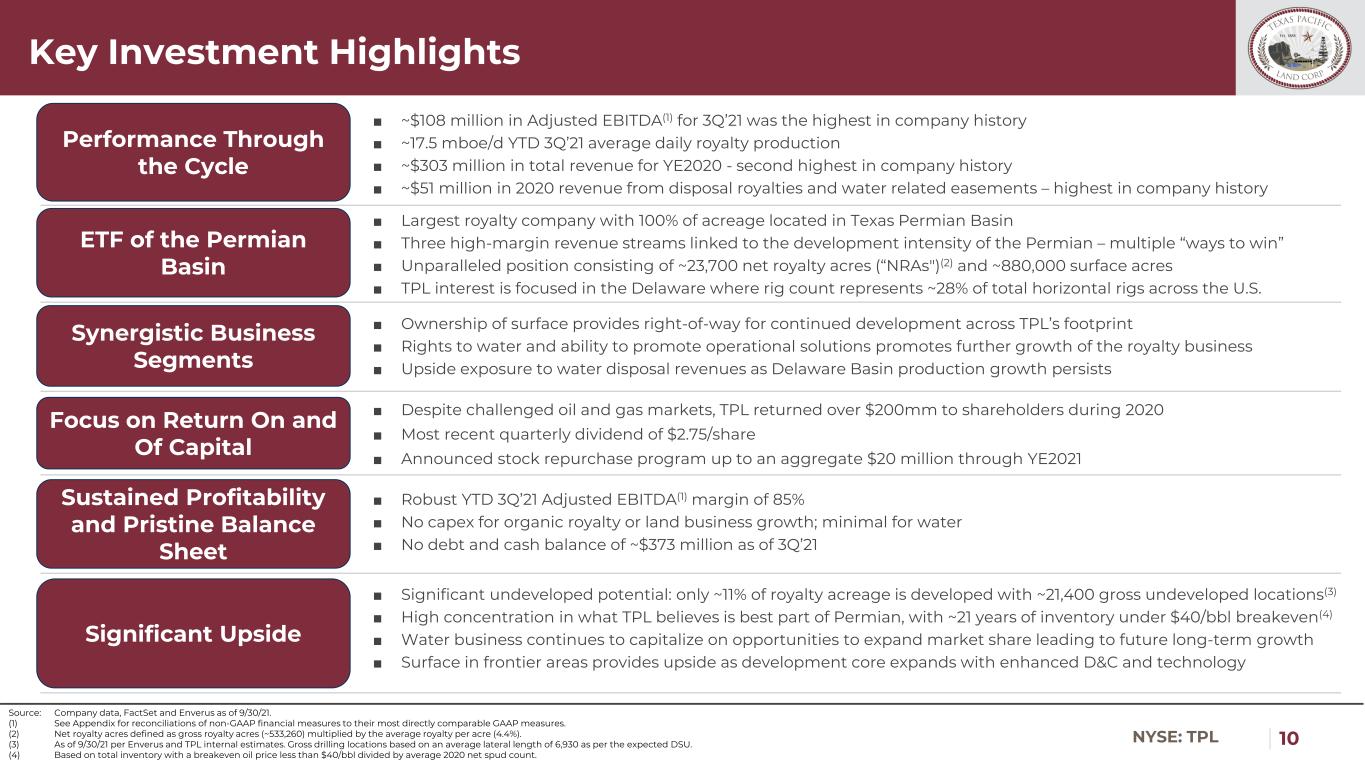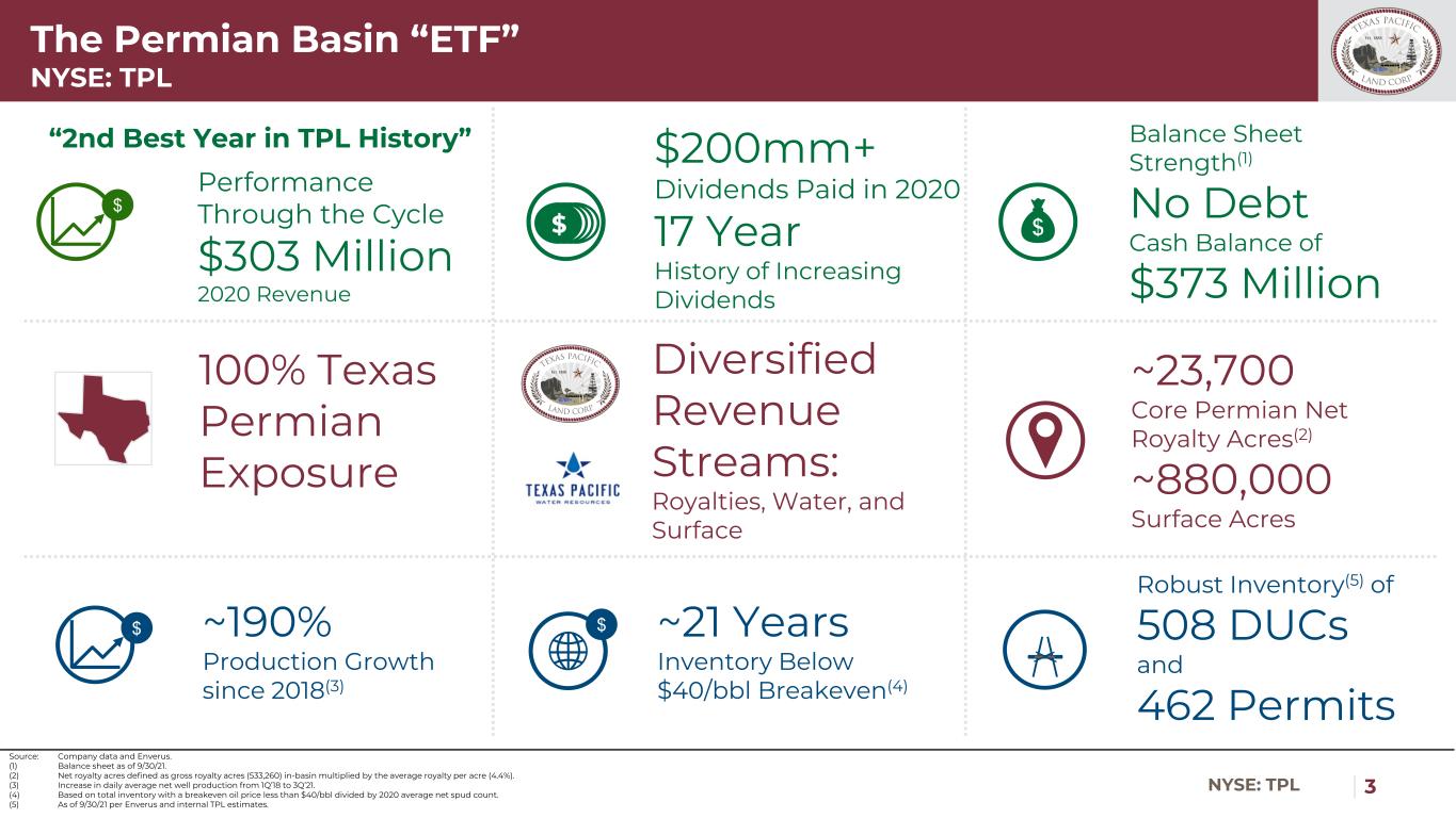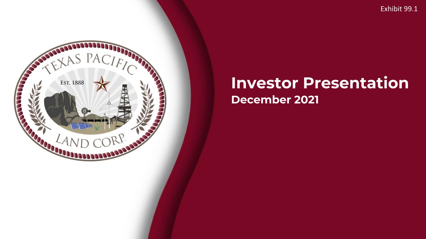 | 2NYSE: TPL This presentation has been designed to provide general information about Texas Pacific Land Corporation and its subsidiaries (“TPL” or the “Company”). Any information contained or referenced herein is suitable only as an introduction to the Company. The recipient is strongly encouraged to refer to and supplement this presentation with information the Company has filed with the Securities and Exchange Commission (“SEC”). The Company makes no representation or warranty, express or implied, as to the accuracy or completeness of the information contained in this presentation, and nothing contained herein is, or shall be, relied upon as a promise or representation, whether as to the past or to the future. This presentation does not purport to include all of the information that may be required to evaluate the subject matter herein and any recipient hereof should conduct its own independent analysis of the Company and the data contained or referred to herein. Unless otherwise stated, statements in this presentation are made as of the date of this presentation, and nothing shall create an implication that the information contained herein is correct as of any time after such date. TPL reserves the right to change any of its opinions expressed herein at any time as it deems appropriate. The Company disclaims any obligations to update the data, information or opinions contained herein or to notify the market or any other party of any such changes, other than required by law. Industry and Market Data The Company has neither sought nor obtained consent from any third party for the use of previously published information. Any such statements or information should not be viewed as indicating the support of such third party for the views expressed herein. The Company shall not be responsible or have any liability for any misinformation contained in any third party report, SEC or other regulatory filing. The industry in which the Company operates is subject to a high degree of uncertainty and risk due to a variety of factors, which could cause our results to differ materially from those expressed in these third-party publications. Some of the data included in this presentation is based on TPL’s good faith estimates, which are derived from TPL’s review of internal sources as well as the third party sources described above. All registered or unregistered service marks, trademarks and trade names referred to in this presentation are the property of their respective owners, and TPL’s use herein does not imply an affiliation with, or endorsement by, the owners of these service marks, trademarks and trade names. Forward-looking Statements This presentation contains certain forward-looking statements within the meaning of the U.S. federal securities laws that are based on TPL’s beliefs, as well as assumptions made by, and information currently available to, TPL, and therefore involve risks and uncertainties that are difficult to predict. These statements include, but are not limited to, statements about strategies, plans, objectives, expectations, intentions, expenditures and assumptions and other statements that are not historical facts. When used in this document, words such as “anticipate,” “believe,” “estimate,” “expect,” “intend,” “plan” and “project” and similar expressions are intended to identify forward-looking statements. You should not place undue reliance on these forward-looking statements. Although we believe our plans, intentions and expectations reflected in or suggested by the forward-looking statements we make in this presentation are reasonable, we may be unable to achieve these plans, intentions or expectations and actual results, performance or achievements may vary materially and adversely from those envisaged in this document. For more information concerning factors that could cause actual results to differ from those expressed or forecasted, see TPL’s annual report on Form 10-K and quarterly reports on Form 10-Q filed with the SEC. The tables, graphs, charts and other analyses provided throughout this document are provided for illustrative purposes only and there is no guarantee that the trends, outcomes or market conditions depicted on them will continue in the future. There is no assurance or guarantee with respect to the prices at which the Company’s common stock will trade, and such securities may not trade at prices that may be implied herein. TPL’s forecasts and expectations for future periods are dependent upon many assumptions, including the drilling and development plans of our customers, estimates of production and potential drilling locations, which may be affected by commodity price declines, the severity and duration of the COVID-19 pandemic and related economic repercussions or other factors that are beyond TPL’s control. These materials are provided merely for general informational purposes and are not intended to be, nor should they be construed as 1) investment, financial, tax or legal advice, 2) a recommendation to buy or sell any security, or 3) an offer or solicitation to subscribe for or purchase any security. These materials do not consider the investment objective, financial situation, suitability or the particular need or circumstances of any specific individual who may receive or review this presentation, and may not be taken as advice on the merits of any investment decision. Although TPL believes the information herein to be reliable, the Company and persons acting on its behalf make no representation or warranty, express or implied, as to the accuracy or completeness of those statements or any other written or oral communication it makes, safe as provided for by law, and the Company expressly disclaims any liability relating to those statements or communications (or any inaccuracies or omissions therein). These cautionary statements qualify all forward-looking statements attributable to us o