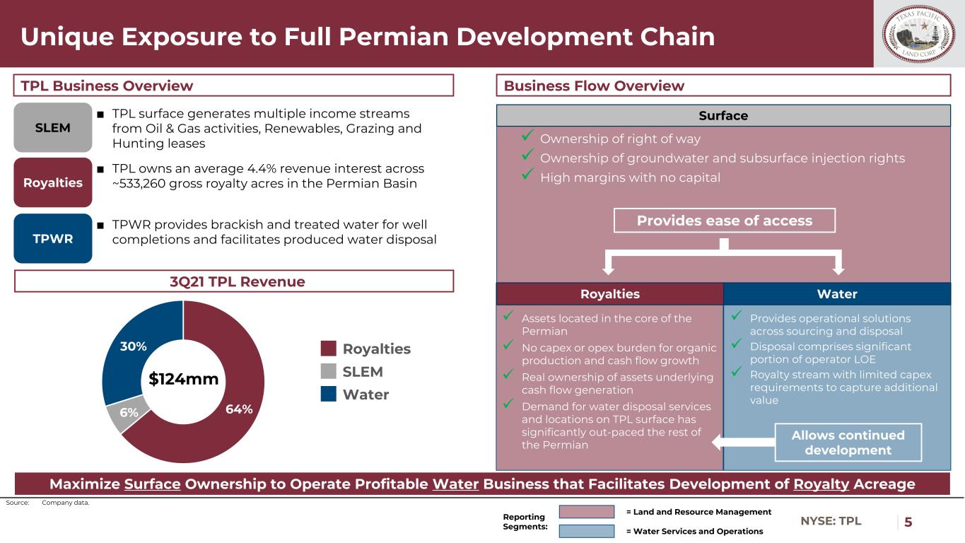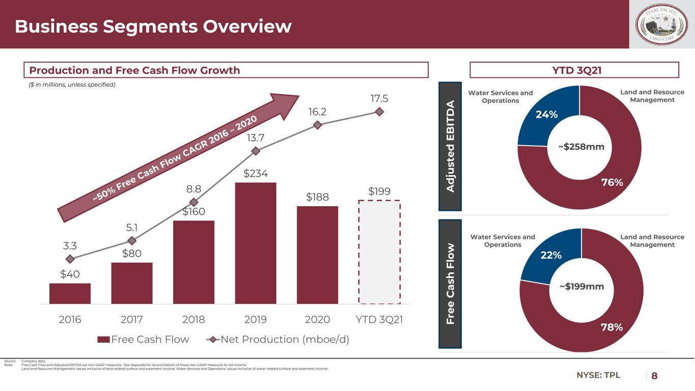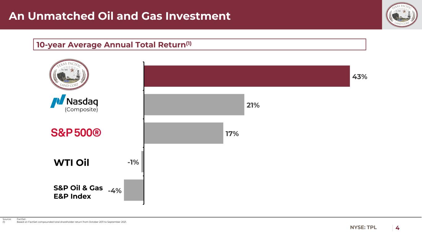 | 2NYSE: TPL This presentation has been designed to provide general information about Texas Pacific Land Corporation and its subsidiaries (“TPL” or the “Company”). Any information contained or referenced herein is suitable only as an introduction to the Company. The recipient is strongly encouraged to refer to and supplement this presentation with information the Company has filed with the Securities and Exchange Commission (“SEC”). The Company makes no representation or warranty, express or implied, as to the accuracy or completeness of the information contained in this presentation, and nothing contained herein is, or shall be, relied upon as a promise or representation, whether as to the past or to the future. This presentation does not purport to include all of the information that may be required to evaluate the subject matter herein and any recipient hereof should conduct its own independent analysis of the Company and the data contained or referred to herein. Unless otherwise stated, statements in this presentation are made as of the date of this presentation, and nothing shall create an implication that the information contained herein is correct as of any time after such date. TPL reserves the right to change any of its opinions expressed herein at any time as it deems appropriate. The Company disclaims any obligations to update the data, information or opinions contained herein or to notify the market or any other party of any such changes, other than required by law. Industry and Market Data The Company has neither sought nor obtained consent from any third party for the use of previously published information. Any such statements or information should not be viewed as indicating the support of such third party for the views expressed herein. The Company shall not be responsible or have any liability for any misinformation contained in any third party report, SEC or other regulatory filing. The industry in which the Company operates is subject to a high degree of uncertainty and risk due to a variety of factors, which could cause our results to differ materially from those expressed in these third-party publications. Some of the data included in this presentation is based on TPL’s good faith estimates, which are derived from TPL’s review of internal sources as well as the third party sources described above. All registered or unregistered service marks, trademarks and trade names referred to in this presentation are the property of their respective owners, and TPL’s use herein does not imply an affiliation with, or endorsement by, the owners of these service marks, trademarks and trade names. Forward-looking Statements This presentation contains certain forward-looking statements within the meaning of the U.S. federal securities laws that are based on TPL’s beliefs, as well as assumptions made by, and information currently available to, TPL, and therefore involve risks and uncertainties that are difficult to predict. These statements include, but are not limited to, statements about strategies, plans, objectives, expectations, intentions, expenditures and assumptions and other statements that are not historical facts. When used in this document, words such as “anticipate,” “believe,” “estimate,” “expect,” “intend,” “plan” and “project” and similar expressions are intended to identify forward-looking statements. You should not place undue reliance on these forward-looking statements. Although we believe our plans, intentions and expectations reflected in or suggested by the forward-looking statements we make in this presentation are reasonable, we may be unable to achieve these plans, intentions or expectations and actual results, performance or achievements may vary materially and adversely from those envisaged in this document. For more information concerning factors that could cause actual results to differ from those expressed or forecasted, see TPL’s annual report on Form 10-K and quarterly reports on Form 10-Q filed with the SEC. The tables, graphs, charts and other analyses provided throughout this document are provided for illustrative purposes only and there is no guarantee that the trends, outcomes or market conditions depicted on them will continue in the future. There is no assurance or guarantee with respect to the prices at which the Company’s common stock will trade, and such securities may not trade at prices that may be implied herein. TPL’s forecasts and expectations for future periods are dependent upon many assumptions, including the drilling and development plans of our customers, estimates of production and potential drilling locations, which may be affected by commodity price declines, the severity and duration of the COVID-19 pandemic and related economic repercussions or other factors that are beyond TPL’s control. These materials are provided merely for general informational purposes and are not intended to be, nor should they be construed as 1) investment, financial, tax or legal advice, 2) a recommendation to buy or sell any security, or 3) an offer or solicitation to subscribe for or purchase any security. These materials do not consider the investment objective, financial situation, suitability or the particular need or circumstances of any specific individual who may receive or review this presentation, and may not be taken as advice on the merits of any investment decision. Although TPL believes the information herein to be reliable, the Company and persons acting on its behalf make no representation or warranty, express or implied, as to the accuracy or completeness of those statements or any other written or oral communication it makes, safe as provided for by law, and the Company expressly disclaims any liability relating to those statements or communications (or any inaccuracies or omissions therein). These cautionary statements qualify all forward-looking statements attributable to us o