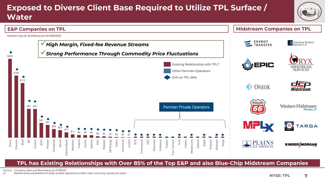 | 7NYSE: TPL High Margin, Fixed-fee Revenue Streams Strong Performance Through Commodity Price Fluctuations$249 $196 $173 $91 $91 $47 $41 $28 $24 $17 $11 $9 $9 $8 $5 $4 $3 $2 $2 $1 Ex xo n C he vr on Sh el l BP C on oc o EO G Pi on ee r O cc id en ta l D ev on D ia m on db ac k M ar at ho n C ot er ra O vi nt iv Ap ac he PD C M at ad or SM E ne rg y C al lo n C en te nn ia l La re do BT A C ro w nq ue st D E3 D is co ve ry En de av or Fa sk en Fo ur C or ne rs H un t Le ga cy M ew bo ur ne Sa bi na l Sa bl e Se qu itu r Sh er id an Su rg e Exposed to Diverse Client Base Required to Utilize TPL Surface / Water Source: Company data and Bloomberg as of 9/30/21. (1) Relationships established through surface operations and/or water sourcing / produced water. Existing Relationship with TPL(1) Other Permian Operators Drill on TPL NRA TPL has Existing Relationships with Over 85% of the Top E&P and also Blue-Chip Midstream Companies E&P Companies on TPL Midstream Companies on TPL Market Cap (in $ billions) as of 9/30/2021 Permian Private Operators