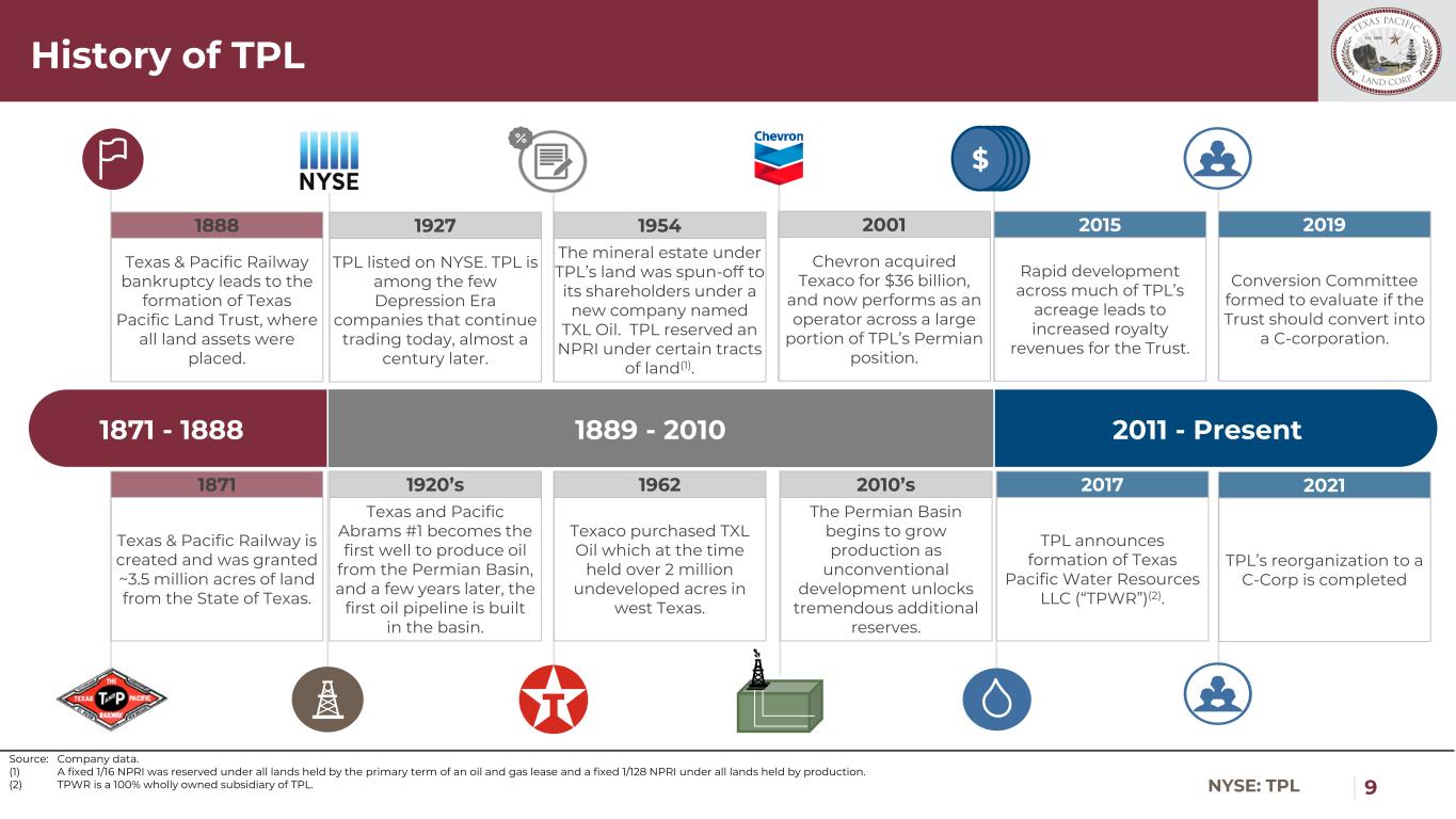 | 9NYSE: TPL History of TPL Source: Company data. (1) A fixed 1/16 NPRI was reserved under all lands held by the primary term of an oil and gas lease and a fixed 1/128 NPRI under all lands held by production. (2) TPWR is a 100% wholly owned subsidiary of TPL. 1871 - 1888 1889 - 2010 2011 - Present Texas & Pacific Railway bankruptcy leads to the formation of Texas Pacific Land Trust, where all land assets were placed. 1888 Texas and Pacific Abrams #1 becomes the first well to produce oil from the Permian Basin, and a few years later, the first oil pipeline is built in the basin. 1920’s The mineral estate under TPL’s land was spun-off to its shareholders under a new company named TXL Oil. TPL reserved an NPRI under certain tracts of land(1). 1954 Texaco purchased TXL Oil which at the time held over 2 million undeveloped acres in west Texas. 1962 Rapid development across much of TPL’s acreage leads to increased royalty revenues for the Trust. 2015 Chevron acquired Texaco for $36 billion, and now performs as an operator across a large portion of TPL’s Permian position. 2001 Conversion Committee formed to evaluate if the Trust should convert into a C-corporation. 2019 Texas & Pacific Railway is created and was granted ~3.5 million acres of land from the State of Texas. 1871 The Permian Basin begins to grow production as unconventional development unlocks tremendous additional reserves. 2010’s TPL announces formation of Texas Pacific Water Resources LLC (“TPWR”)(2). 2017 TPL listed on NYSE. TPL is among the few Depression Era companies that continue trading today, almost a century later. 1927 $ TPL’s reorganization to a C-Corp is completed 2021