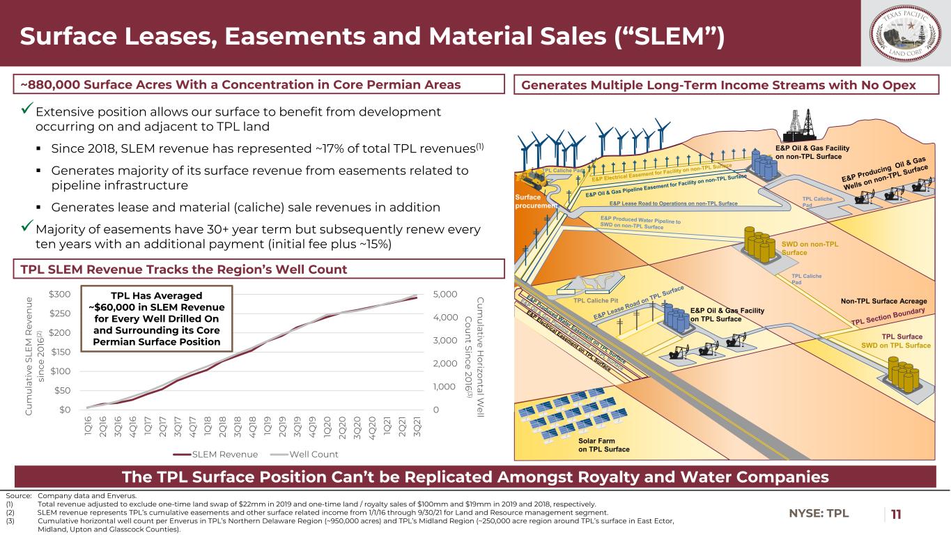 | 10NYSE: TPL Key Investment Highlights Sustained Profitability and Pristine Balance Sheet Focus on Return On and Of Capital ETF of the Permian Basin Performance Through the Cycle ■ Largest royalty company with 100% of acreage located in Texas Permian Basin ■ Three high-margin revenue streams linked to the development intensity of the Permian – multiple “ways to win” ■ Unparalleled position consisting of ~23,700 net royalty acres (“NRAs")(2) and ~880,000 surface acres ■ TPL interest is focused in the Delaware where rig count represents ~28% of total horizontal rigs across the U.S. ■ Despite challenged oil and gas markets, TPL returned over $200mm to shareholders during 2020 ■ Most recent quarterly dividend of $2.75/share ■ Announced stock repurchase program up to an aggregate $20 million through YE2021 ■ Robust YTD 3Q’21 Adjusted EBITDA(1) margin of 85% ■ No capex for organic royalty or land business growth; minimal for water ■ No debt and cash balance of ~$373 million as of 3Q’21 ■ Significant undeveloped potential: only ~11% of royalty acreage is developed with ~21,400 gross undeveloped locations(3) ■ High concentration in what TPL believes is best part of Permian, with ~21 years of inventory under $40/bbl breakeven(4) ■ Water business continues to capitalize on opportunities to expand market share leading to future long-term growth ■ Surface in frontier areas provides upside as development core expands with enhanced D&C and technology Source: Company data, FactSet and Enverus as of 9/30/21. (1) See Appendix for reconciliations of non-GAAP financial measures to their most directly comparable GAAP measures. (2) Net royalty acres defined as gross royalty acres (~533,260) multiplied by the average royalty per acre (4.4%). (3) As of 9/30/21 per Enverus and TPL internal estimates. Gross drilling locations based on an average lateral length of 6,930 as per the expected DSU. (4) Based on total inventory with a breakeven oil price less than $40/bbl divided by average 2020 net spud count. Synergistic Business Segments ■ Ownership of surface provides right-of-way for continued development across TPL’s footprint ■ Rights to water and ability to promote operational solutions promotes further growth of the royalty business ■ Upside exposure to water disposal revenues as Delaware Basin production growth persists Significant Upside ■ ~$108 million in Adjusted EBITDA(1) for 3Q’21 was the highest in company history ■ ~17.5 mboe/d YTD 3Q’21 average daily royalty production ■ ~$303 million in total revenue for YE2020 - second highest in company history ■ ~$51 million in 2020 revenue from disposal royalties and water related easements – highest in company history