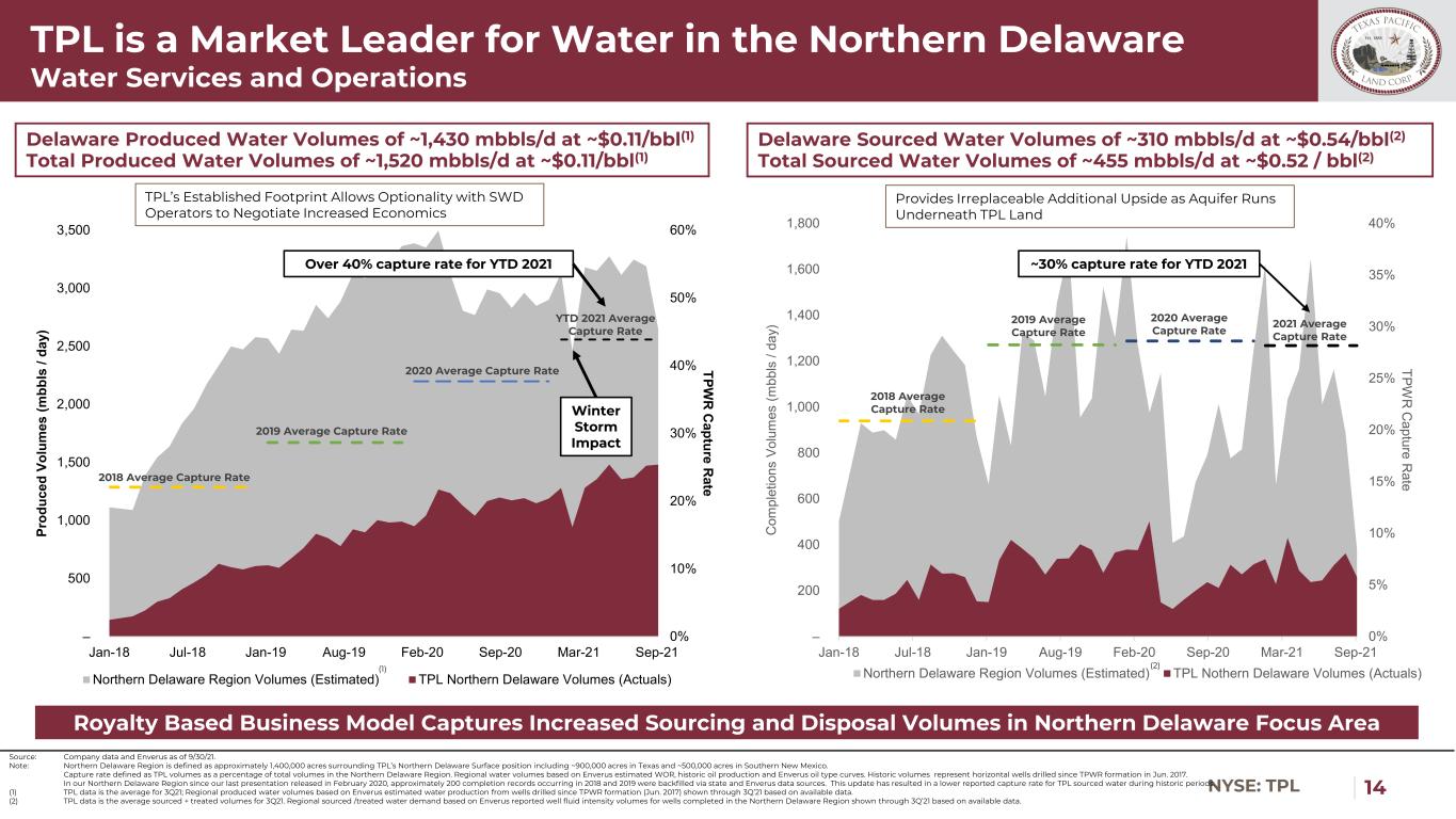 | 13NYSE: TPL $0 $10 $20 $30 $40 $50 $60 $70 $80 $0.0 $2.0 $4.0 $6.0 $8.0 $10.0 $12.0 $14.0 $16.0 $18.0 1Q18 2Q18 3Q18 4Q18 1Q19 2Q19 3Q19 4Q19 1Q20 2Q20 3Q20 4Q20 1Q21 2Q21 3Q21 Produced water royalties ($mm) WTI Cushing ($/bbl) Growth Strategy and Competitive Advantage Water Services and Operations Produced Water Royalties Stability Through the Cycle Significant Acreage Dedicated to TPL Disposal Royalties Source: Company data and FactSet. ($ in millions) Royalty Based Business Model Captures Increased Disposal Volumes in Northern Delaware Focus Area Despite 2020’s challenging back drop of COVID-19 and oil price weakness, TPL’s produced water royalty business generated its highest ever annual revenue ■ Current and future wells drilled within TPL’s ~450,000-acre dedication provide a significant base for disposal royalty growth in the future ■ In addition, TPL collects royalties on significant disposal volumes that are produced outside the contracted acreage but brought into TPL’s associated systems for disposal providing additional growth opportunities in the future LEAEDDY Over 70% or ~450,000 acres in TPL’s core northern Delaware region is dedicated to systems where TPL has disposal royalties Core N. Delaware Region ~610,000 acres TPL Surface Acreage ~245,000 acres Strong YTD 3Q21 performance