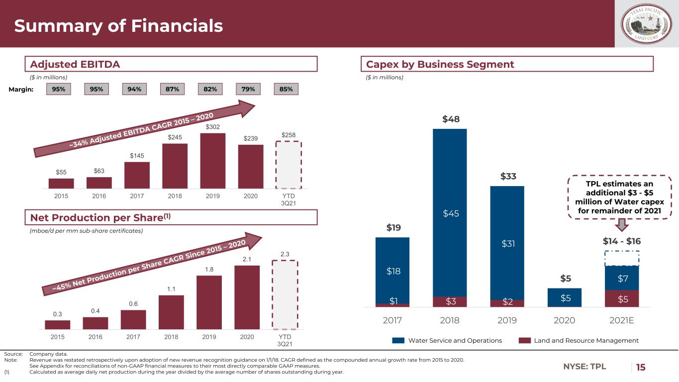 | 14NYSE: TPL 0% 5% 10% 15% 20% 25% 30% 35% 40% – 200 400 600 800 1,000 1,200 1,400 1,600 1,800 Jan-18 Jul-18 Jan-19 Aug-19 Feb-20 Sep-20 Mar-21 Sep-21 TPW R C apture R ate C om pl et io ns V ol um es (m bb ls / da y) Northern Delaware Region Volumes (Estimated) TPL Nothern Delaware Volumes (Actuals) 0% 10% 20% 30% 40% 50% 60% – 500 1,000 1,500 2,000 2,500 3,000 3,500 Jan-18 Jul-18 Jan-19 Aug-19 Feb-20 Sep-20 Mar-21 Sep-21 TPW R C apture R ate Pr od uc ed V ol um es (m bb ls / da y) Northern Delaware Region Volumes (Estimated) TPL Northern Delaware Volumes (Actuals) Source: Company data and Enverus as of 9/30/21. Note: Northern Delaware Region is defined as approximately 1,400,000 acres surrounding TPL’s Northern Delaware Surface position including ~900,000 acres in Texas and ~500,000 acres in Southern New Mexico. Capture rate defined as TPL volumes as a percentage of total volumes in the Northern Delaware Region. Regional water volumes based on Enverus estimated WOR, historic oil production and Enverus oil type curves. Historic volumes represent horizontal wells drilled since TPWR formation in Jun. 2017. In our Northern Delaware Region since our last presentation released in February 2020, approximately 200 completion records occurring in 2018 and 2019 were backfilled via state and Enverus data sources. This update has resulted in a lower reported capture rate for TPL sourced water during historic periods. (1) TPL data is the average for 3Q21; Regional produced water volumes based on Enverus estimated water production from wells drilled since TPWR formation (Jun. 2017) shown through 3Q’21 based on available data. (2) TPL data is the average sourced + treated volumes for 3Q21. Regional sourced /treated water demand based on Enverus reported well fluid intensity volumes for wells completed in the Northern Delaware Region shown through 3Q’21 based on available data. TPL is a Market Leader for Water in the Northern Delaware Water Services and Operations Delaware Produced Water Volumes of ~1,430 mbbls/d at ~$0.11/bbl(1) Total Produced Water Volumes of ~1,520 mbbls/d at ~$0.11/bbl(1) Delaware Sourced Water Volumes of ~310 mbbls/d at ~$0.54/bbl(2) Total Sourced Water Volumes of ~455 mbbls/d at ~$0.52 / bbl(2) Provides Irreplaceable Additional Upside as Aquifer Runs Underneath TPL Land Royalty Based Business Model Captures Increased Sourcing and Disposal Volumes in Northern Delaware Focus Area (1) 2019 Average Capture Rate TPL’s Established Footprint Allows Optionality with SWD Operators to Negotiate Increased Economics (2) 2018 Average Capture Rate 2020 Average Capture Rate 2019 Average Capture Rate 2018 Average Capture Rate 2020 Average Capture Rate Over 40% capture rate for YTD 2021 ~30% capture rate for YTD 2021 Winter Storm Impact YTD 2021 Average Capture Rate 2021 Average Capture Rate