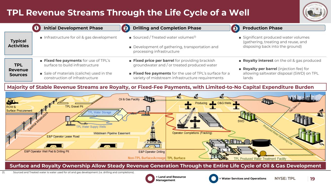 | 24NYSE: TPL Gross Royalty Acres Royalty Key Terms Land and Resource Management Net Royalty Acres (Normalized to 1/8) Net Royalty Acres Drilling Spacing Units (“DSUs”) Implied Average Net Revenue Interest per Well Description How’s It Calculated ■ An undivided ownership of the oil, gas, and minerals underneath one acre of land ■ Total Texas Pacific Land Corporation acreage 533,260 ■ Gross Royalty Acres standardized to 12.5% (or 1/8) oil and gas lease royalty ■ Gross Royalty Acres standardized on a 100% (or 8/8) oil and gas lease royalty basis ■ Areas designated in a spacing order or unit designation as a unit and within which operators drill wellbores to develop our oil and natural gas rights ■ Number of 100% oil and gas lease royalty acres per gross DSU acre ■ Gross Royalty Acres * Avg. royalty / (1/8) 189,720 = 533,260 * 4.4% / (1/8) ■ Gross Royalty Acres * Avg. royalty 23,715 = 533,260 * 4.4% ■ Total number of gross DSU acres 1,428,638 ■ Net Royalty Acres / Gross DSU Acres 1.7% = 23,715 / 1,428,638 Source: Company data and Enverus. Note: Other areas include Eastern Shelf, Western Delaware, and Central Basin Platform. (1) Excluding acres which are considered to be outside of Basin. Focus Area(1 ) Gross Royalty Acres Net Royalty Acres Average Royalty Gross DSU Acres Implied Average Net Revenue Interest per Well Northern Delaware 1 55,364 9,206 5.9% 399,860 2.3% Southeast Delaware 34,285 2,1 26 6.2% 1 01 ,993 2.1 % Southwest Delaware 81 ,795 5,1 1 2 6.2% 1 68,459 3.0% Delaware 271 ,444 16,444 6.1% 670,312 2.4% Midland 150,888 2,640 1 .7% 499,709 0.5% Other 1 1 0,928 4,631 4.2% 258,61 7 1 .8% Total 533,260 23,715 4.4% 1 ,428,638 1 .7%