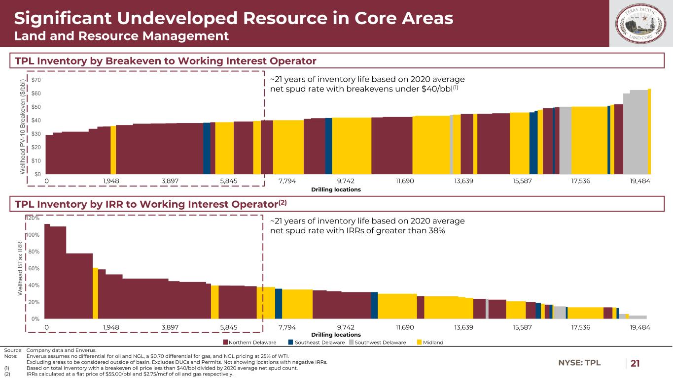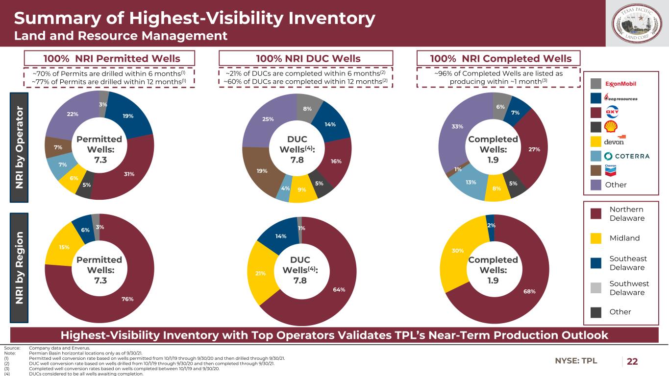 | 21NYSE: TPL 0% 20% 40% 60% 80% 100% 120% 1 626 1,251 1,876 2,501 3,126 3,751 4,376 5,001 5,626 6,251 6,876 7,501 8,126 8,751 9,376 10,001 10,626 11,251 11,876 12,501 13,126 13,751 14,376 15,001 15,626 16,251 16,876 17,501 18,126 18,751 19,376 W el lh ea d BT ax IR R $0 $10 $20 $30 $40 $50 $60 $70 1 626 1,251 1,876 2,501 3,126 3,751 4,376 5,001 5,626 6,251 6,876 7,501 8,126 8,751 9,376 10,001 10,626 11,251 11,876 12,501 13,126 13,751 14,376 15,001 15,626 16,251 16,876 17,501 18,126 18,751 19,376 W el lh ea d PV -1 0 Br ea ke ve n ($ /b bl ) Significant Undeveloped Resource in Core Areas Land and Resource Management TPL Inventory by Breakeven to Working Interest Operator TPL Inventory by IRR to Working Interest Operator(2) Source: Company data and Enverus. Note: Enverus assumes no differential for oil and NGL, a $0.70 differential for gas, and NGL pricing at 25% of WTI. Excluding areas to be considered outside of basin. Excludes DUCs and Permits. Not showing locations with negative IRRs. (1) Based on total inventory with a breakeven oil price less than $40/bbl divided by 2020 average net spud count. (2) IRRs calculated at a flat price of $55.00/bbl and $2.75/mcf of oil and gas respectively. Northern Delaware Southeast Delaware Southwest Delaware Midland ~21 years of inventory life based on 2020 average net spud rate with breakevens under $40/bbl(1) ~21 years of inventory life based on 2020 average net spud rate with IRRs of greater than 38% Drilling locations Drilling locations 0 1,948 3,897 5,84 7,794 9,742 1,690 1 ,639 15,587 17,536 19,484 0 1,948 3,897 5,845 7,794 9,742 11,690 13,639 15,587 17,536 19,484