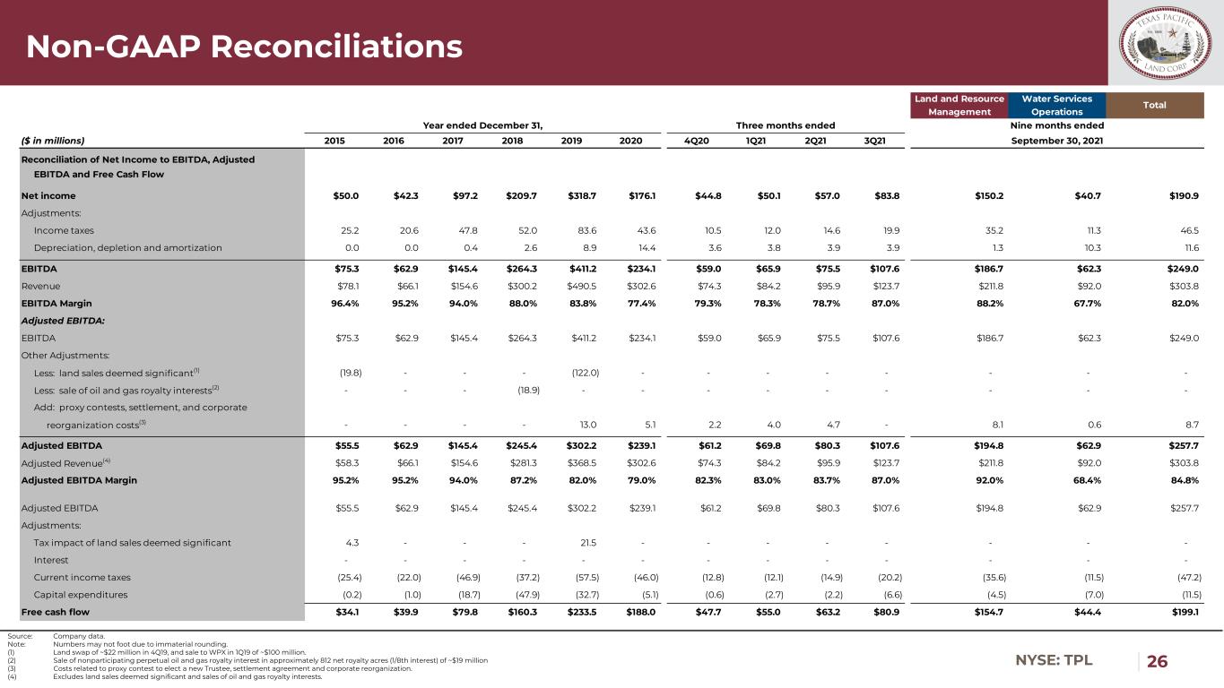 | 25NYSE: TPL Historical Financial Summary Source: Company data. Note: Numbers may not foot due to immaterial rounding. Year ended December 31, Three months ended, ($ in millions) 2019 2020 3Q20 2Q21 3Q21 Total Acres 901,787 880,523 881,335 880,501 880,501 Revenues: Oil and gas royalties $154.7 $137.9 $31.8 $58.2 $79.1 Water sales 85.0 54.9 12.1 12.5 19.6 Produced water royalties 39.1 50.6 12.2 15.5 15.1 Easements and other surface-related income 76.3 41.4 6.7 9.0 9.8 Land sales 135.0 17.4 11.5 0.7 – Sale of oil and gas royalty interests – – – – – Other operating revenue 0.4 0.3 0.1 0.1 0.1 Total Revenues $490.5 $302.6 $74.4 $95.9 $123.7 Expenses: Salaries and related employee benefits 35.0 32.2 7.7 13.3 8.5 Water service related expenses 20.8 14.2 2.3 3.6 3.6 General and administrative expenses 9.6 9.8 1.9 2.8 2.8 Legal and professional fees 16.4 10.8 2.0 1.1 1.6 Land sales expenses 0.2 4.0 0.1 0.0 – Depreciation, depletion and amortization 8.9 14.4 3.8 3.9 3.9 Total operating expenses $90.9 $85.3 $17.6 $24.7 $20.5 Operating income (loss) $399.6 $217.3 $56.7 $71.3 $103.2 Margin (%) 81.5% 71.8% 76.3% 74.3% 83.5% Other income (expense) 2.7 2.4 1.3 0.4 0.5 Income before income taxes $402.3 $219.7 $58.0 $71.7 $103.8 Income tax expense 83.6 43.6 11.8 14.6 19.9 Net income $318.7 $176.1 $46.3 $57.0 $83.8 Margin (%) 65.0% 58.2% 62.2% 59.5% 67.8% Key balance sheet items: 2019 2020 3Q20 2Q21 3Q21 Cash and cash equivalents $303.6 $281.0 $315.8 $329.1 $372.8 Total debt – – – – – Total capital 512.1 485.2 519.2 547.2 601.0 Total assets 598.2 571.6 601.2 633.8 695.6 Total liabilities 86.0 86.5 82.0 86.7 94.6
