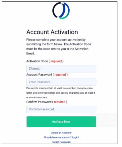 Copy and paste Activation Code or click Activate Account link. Create Password based on password requirements listed.