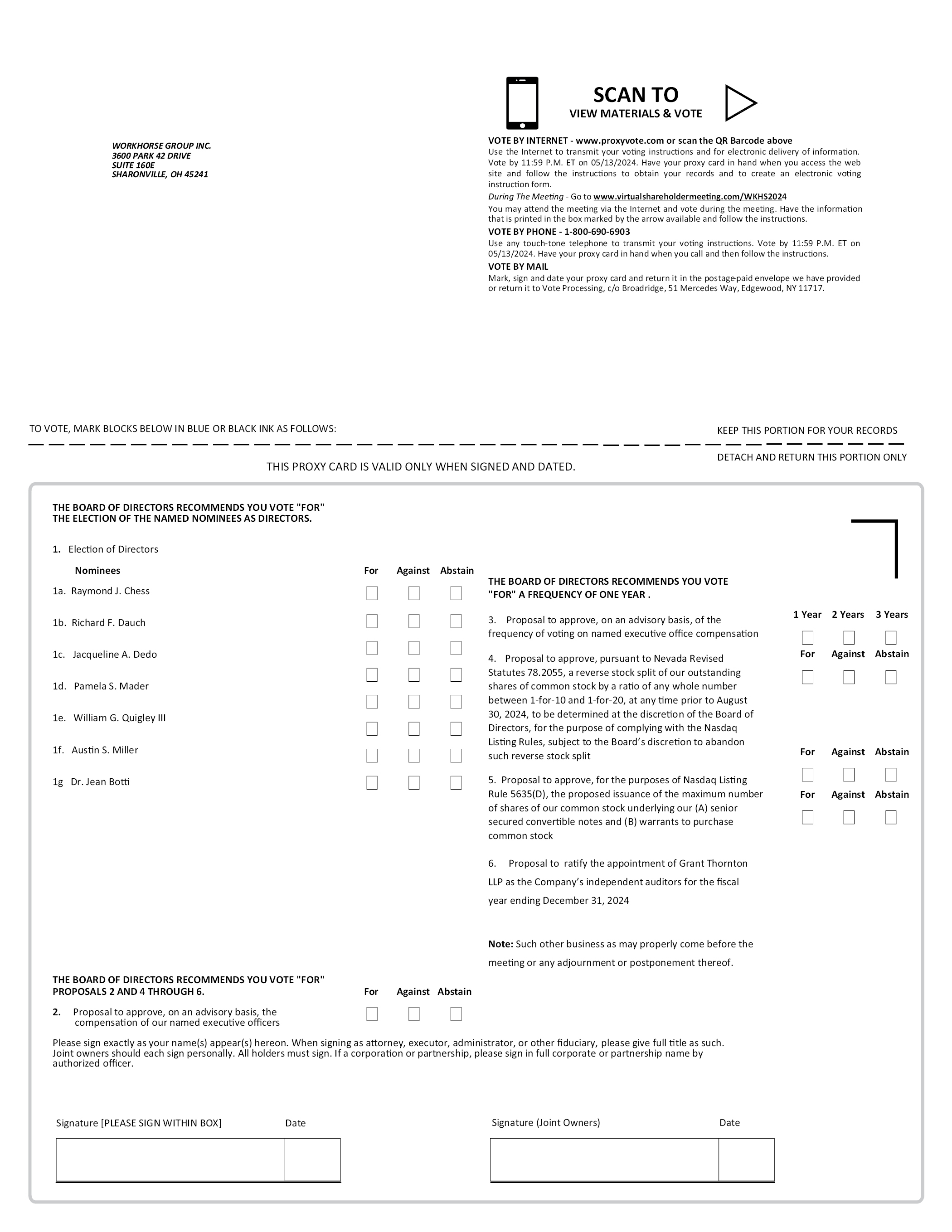 WORKHORSE GROUP INC. 3600 PARK 42 DRIVE SUITE 160E SHARONVILLE, OH 45241 SCAN TO VIEW MATERIALS & VOTE VOTE BY INTERNET - www.proxyvote.com or scan the QR Barcode above Use the Internet to transmit your voting instructions and for electronic delivery of information. Vote by 11:59 P.M. ET on 05/13/2024. Have your proxy card in hand when you access the web site and follow the instructions to obtain your records and to create an electronic voting instruction form. During The Meeting - Go to www.virtualshareholdermeeting.com/WKHS2024 You may attend the meeting via the Internet and vote during the meeting. Have the information that is printed in the box marked by the arrow available and follow the instructions. VOTE BY PHONE - 1-800-690-6903 Use any touch-tone telephone to transmit your voting instructions. Vote by 11:59 P.M. ET on 05/13/2024. Have your proxy card in hand when you call and then follow the instructions. VOTE BY MAIL Mark, sign and date your proxy card and return it in the postage-paid envelope we have provided or return it to Vote Processing, c/o Broadridge, 51 Mercedes Way, Edgewood, NY 11717. TO VOTE, MARK BLOCKS BELOW IN BLUE OR BLACK INK AS FOLLOWS: THIS PROXY CARD IS VALID ONLY WHEN SIGNED AND DATED. KEEP THIS PORTION FOR YOUR RECORDS DETACH AND RETURN THIS PORTION ONLY THE BOARD OF DIRECTORS RECOMMENDS YOU VOTE “FOR” THE ELECTION OF THE NAMED NOMINEES AS DIRECTORS. 1. Election of Directors Nominees For Against Abstain 1a. Raymond J. Chess 1b. Richard F. Dauch 1c. Jacqueline A. Dedo 1d. Pamela S. Mader 1e. William G. Quigley III 1f. Austin S. Miller 1g Dr. Jean Botti THE BOARD OF DIRECTORS RECOMMENDS YOU VOTE “FOR” A FREQUENCY OF ONE YEAR .3. Proposal to approve, on an advisory basis, of the frequency of voting on named executive office compensation 4. Proposal to approve, pursuant to Nevada Revised Statutes 78.2055, a reverse stock split of our outstanding shares of common stock by a ratio of any whole number between 1-for-10 and 1-for-20, at any time prior to August 30, 2024, to be determined at the discretion of the Board of Directors, for the purpose of complying with the Nasdaq Listing Rules, subject to the Board’s discretion to abandon such reverse stock split 5. Proposal to approve, for the purposes of Nasdaq Listing Rule 5635(D), the proposed issuance of the maximum number of shares of our common stock underlying our (A) senior secured convertible notes and (B) warrants to purchase common stock 6. Proposal to ratify the appointment of Grant Thornton LLP as the Company’s independent auditors for the fiscal year ending December 31, 2024 Note: Such other business as may properly come before the meeting or any adjournment or postponement thereof. 1 Year 2 Years 3 Years For Against Abstain For Against Abstain For Against Abstain THE BOARD OF DIRECTORS RECOMMENDS YOU VOTE “FOR” PROPOSALS 2 AND 4 THROUGH 6. For Against Abstain 2. Proposal to approve, on an advisory basis, the compensation of our named executive officers Please sign exactly as your name(s) appear(s) hereon. When signing as attorney, executor, administrator, or other fiduciary, please give full title as such. Joint owners should each sign personally. All holders must sign. If a corporation or partnership, please sign in full corporate or partnership name by authorized officer. Signature [PLEASE SIGN WITHIN BOX] Date Signature (Joint Owners) Date
