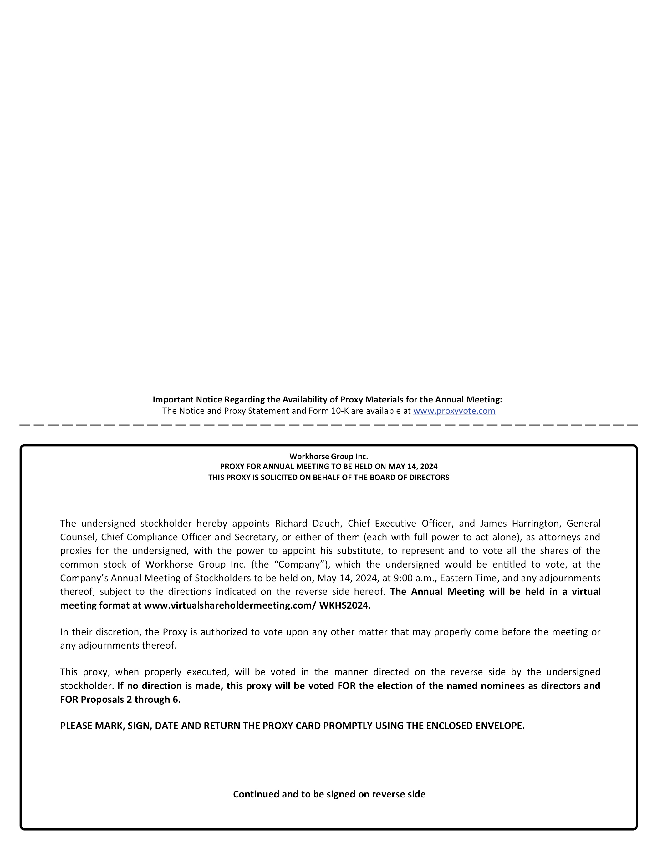 Important Notice Regarding the Availability of Proxy Materials for the Annual Meeting: The Notice and Proxy Statement and Form 10-K are available at www.proxyvote.com Workhorse Group Inc. PROXY FOR ANNUAL MEETING TO BE HELD ON MAY 14, 2024 THIS PROXY IS SOLICITED ON BEHALF OF THE BOARD OF DIRECTORS The undersigned stockholder hereby appoints Richard Dauch, Chief Executive Officer, and James Harrington, General Counsel, Chief Compliance Officer and Secretary, or either of them (each with full power to act alone), as attorneys and proxies for the undersigned, with the power to appoint his substitute, to represent and to vote all the shares of the common stock of Workhorse Group Inc. (the “Company”), which the undersigned would be entitled to vote, at the Company’s Annual Meeting of Stockholders to be held on, May 14, 2024, at 9:00 a.m., Eastern Time, and any adjournments thereof, subject to the directions indicated on the reverse side hereof. The Annual Meeting will be held in a virtual meeting format at www.virtualshareholdermeeting.com/ WKHS2024. In their discretion, the Proxy is authorized to vote upon any other matter that may properly come before the meeting or any adjournments thereof. This proxy, when properly executed, will be voted in the manner directed on the reverse side by the undersigned stockholder. If no direction is made, this proxy will be voted FOR the election of the named nominees as directors and FOR Proposals 2 through 6. PLEASE MARK, SIGN, DATE AND RETURN THE PROXY CARD PROMPTLY USING THE ENCLOSED ENVELOPE. Continued and to be signed on reverse side